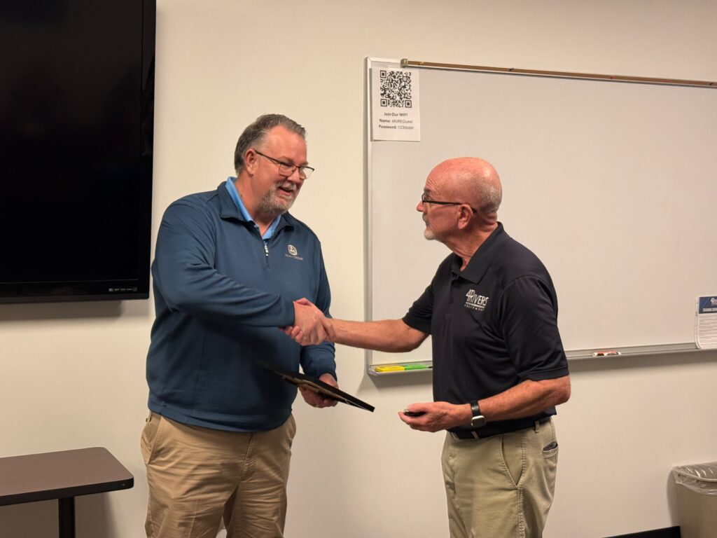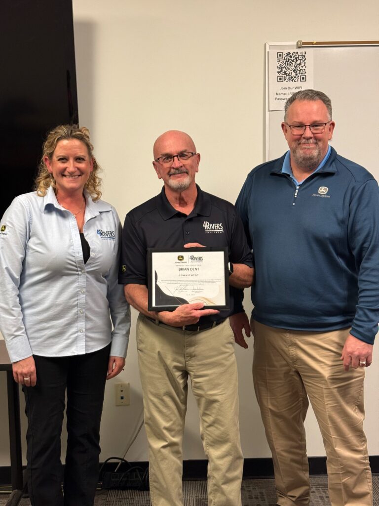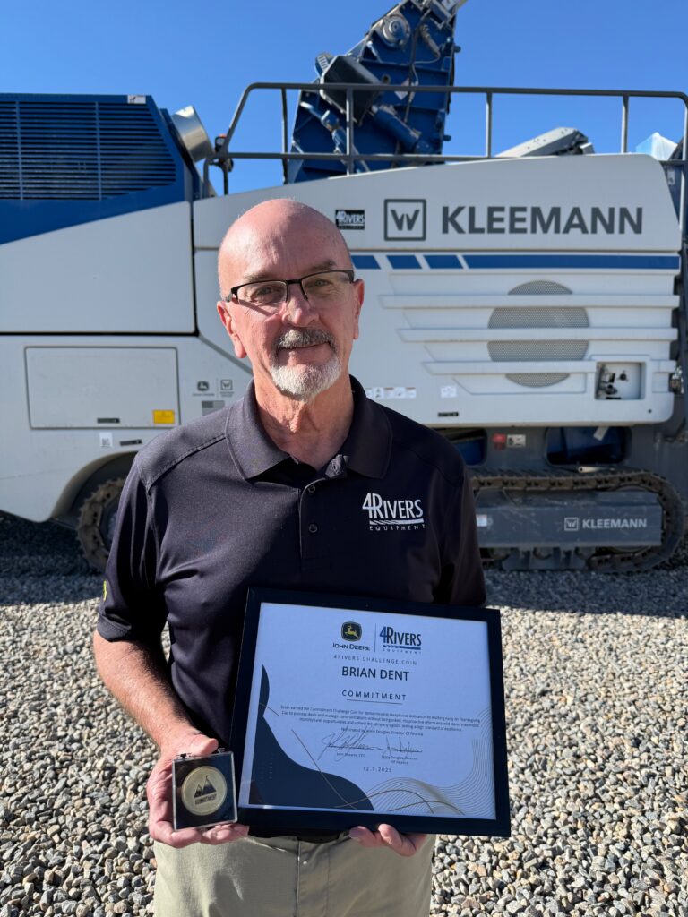 Dahlia Inventory Manager Brian Dent was surprised with a 4Rivers Equipment Challenge Coin on Jan. 15 for his initiative to go above and beyond the call of duty. The Challenge Coin was awarded to Brian in the category of “Commitment.” It was presented to him by CEO John Shearer. Additionally, Director of Finance Jenny Douglass and General Manager Danny Bratton were present.