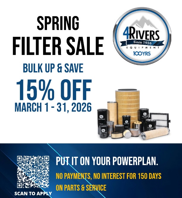 Offer valid March 1 – 31, 2026. While supplies last, based on product availability. Some restrictions apply, see dealer for details. Financing offer valid on qualifying purchases made 01 November 2025 through 31 May 2026. Subject to approved credit on PowerPlan, a revolving credit service of John Deere Financial, f.s.b. For commercial use only: After the promotional period, interest charges will begin to accrue at Prime plus 14.9% APR. Offer requires a minimum purchase of $1,000 for parts and service; $500 for attachments; $200 for technology solutions. Repairs must be made to John Deere equipment using John Deere OEM parts. Prior purchases are not eligible. Available at participating U.S. dealers. Prices and models may vary by dealer.